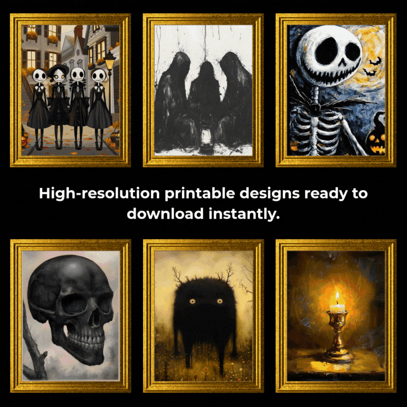 You’ll get over 5000 Halloween & Dark Academia themed wall art prints, all in high-resolution JPEG and PNG formats (300 DPI).
